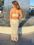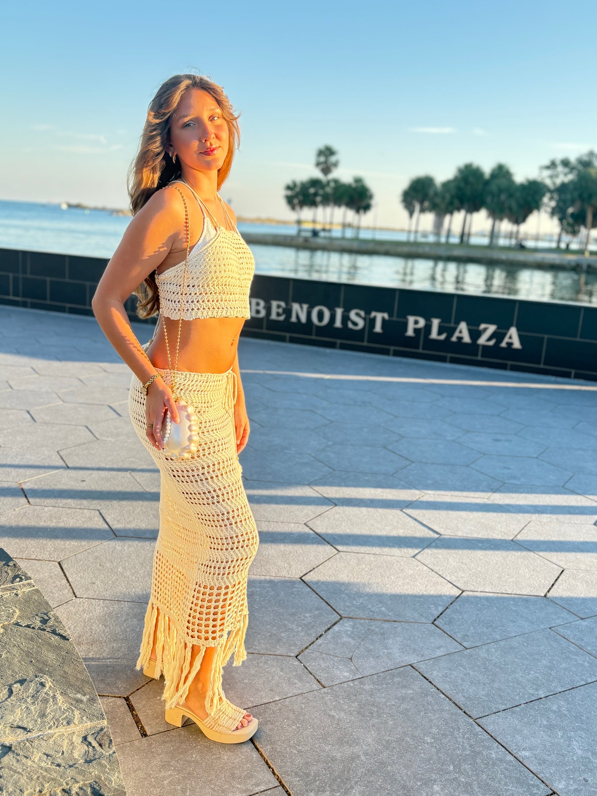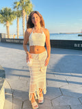 • 2-Piece Crochet Set: Includes a halter crop top + matching maxi skirt with fringe hem for a boho-chic beach look.