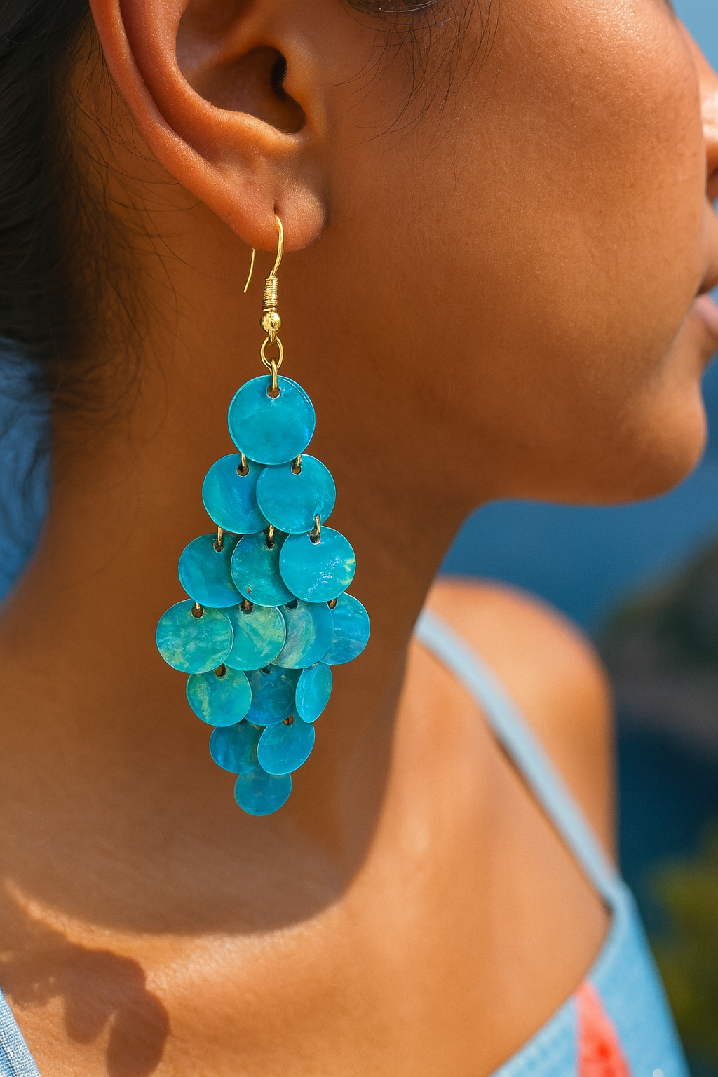 Aqua Siren Dangles – Tiered Shell Disc Earrings, Lightweight Ocean-Inspired Statement Earrings, Beach & Resort Jewelry
