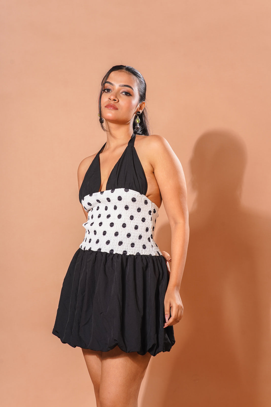 Black & White Polka Dot Mini Dress – Halter Neck Bubble Hem Dress, Flirty Resort & Night-Out Look