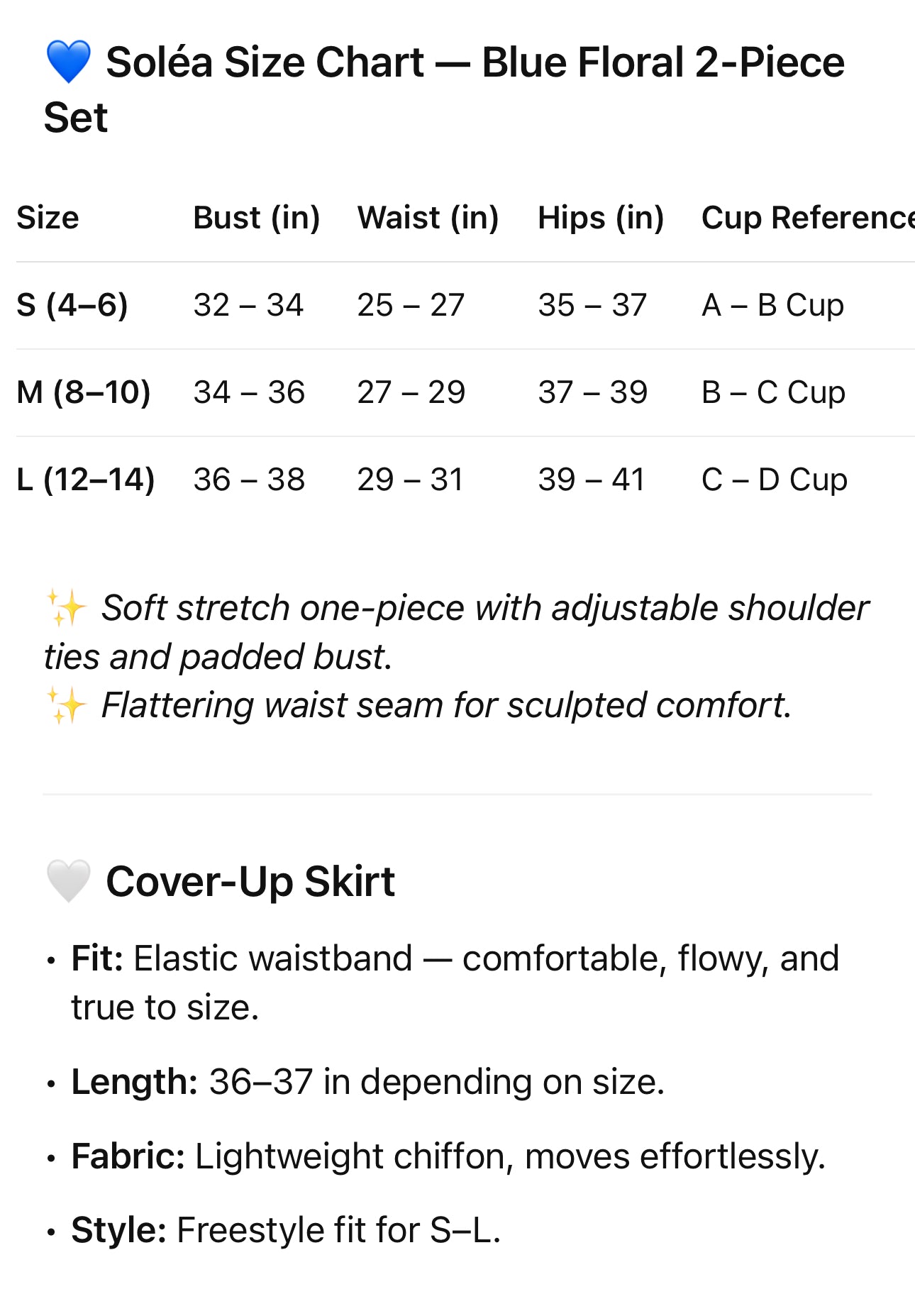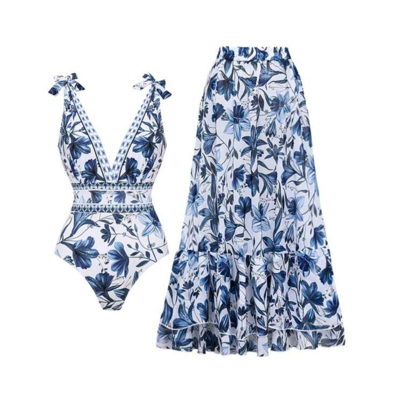 Blue Floral 2-Piece Swim Set with Matching Cover-Up – Deep V Plunge Top & Flowy Floral Skirt