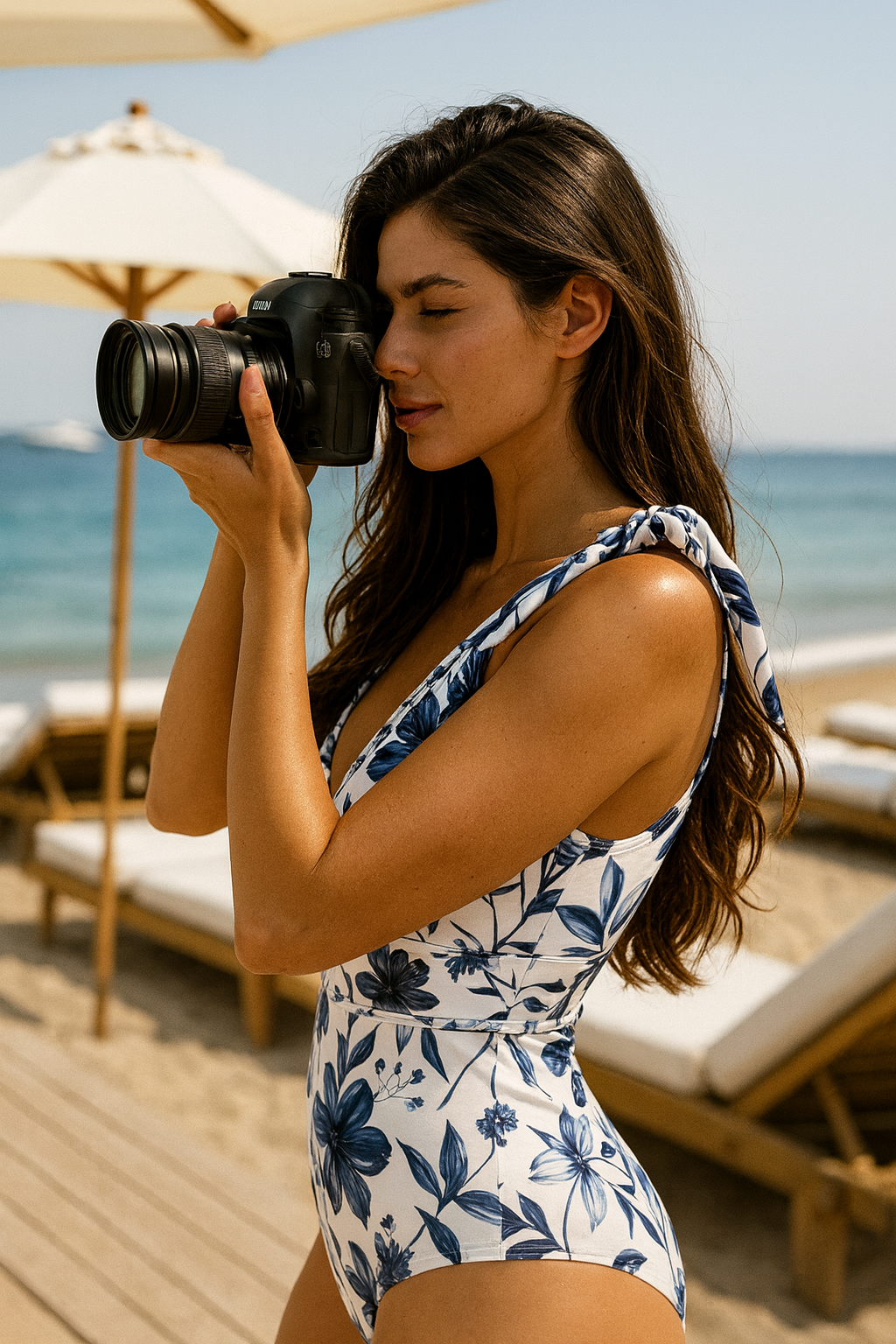 • Mediterranean Floral Print: Blue botanical pattern inspired by St. Tropez, Capri, and Greek island summers — perfect for travel, poolside lounging, and holiday photos.