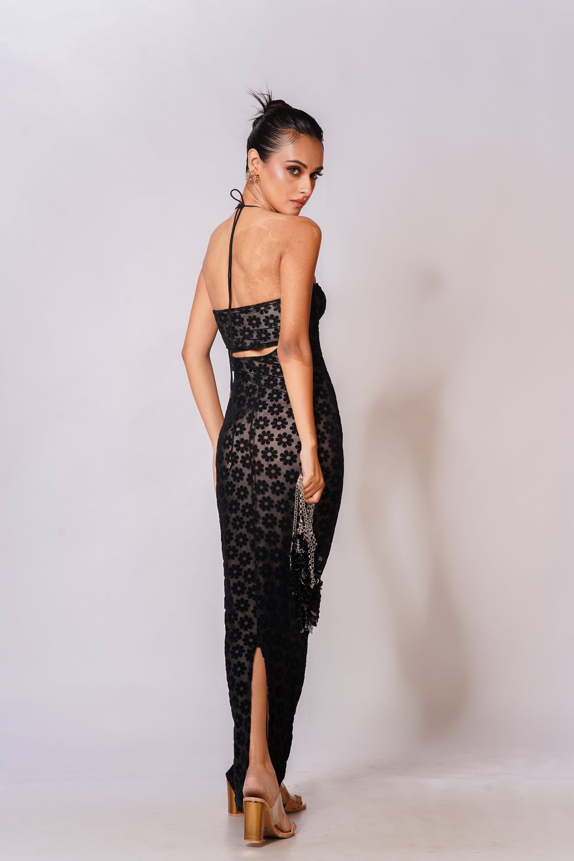 The floor-skimming length elongates the figure, while the body-hugging fit creates a flawless shape from every angle. Perfect for rooftop nights, glamorous events, or evenings that call for unforgettable style.