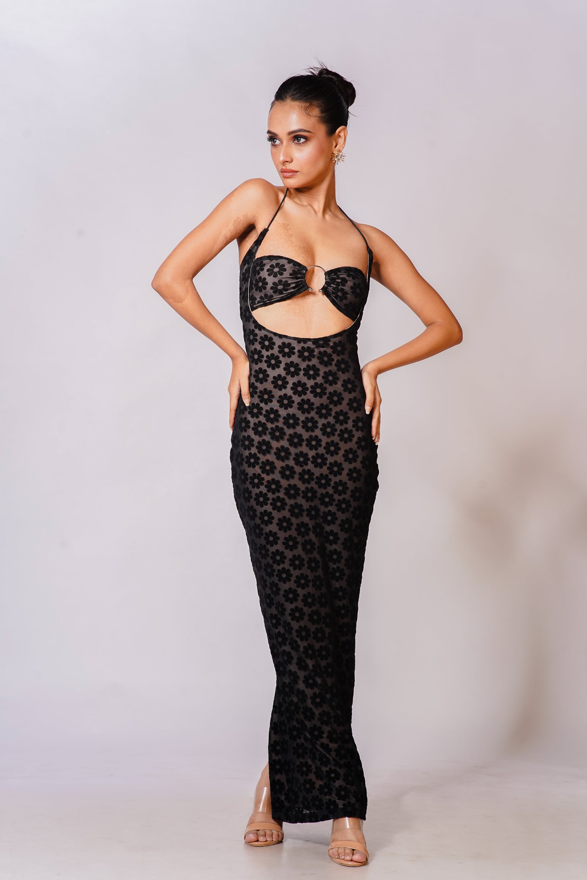 a striking silhouette designed for bold elegance. Crafted in jet-black fabric with a velvety floral texture, this piece features a daring halter neckline, front ring detail, and a sleek cut-out that frames the waist with confidence.