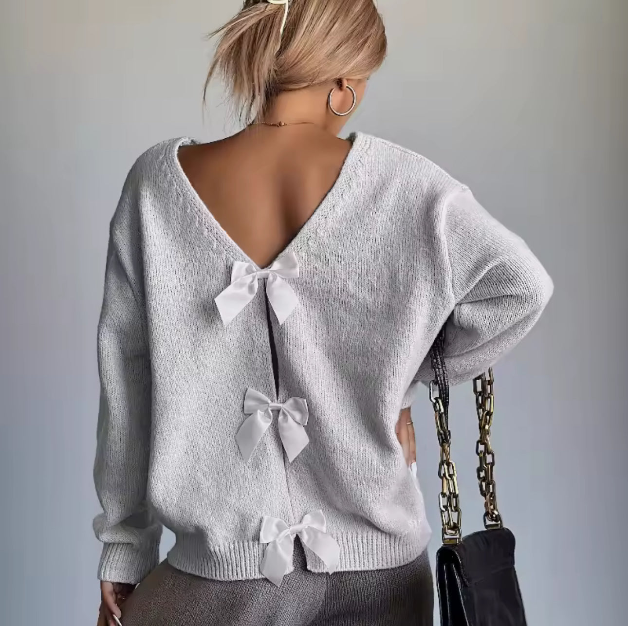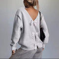RibbonBack Cozy Knit Sweater – Soft V-Back Pullover with Elegant Satin Bow Details