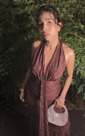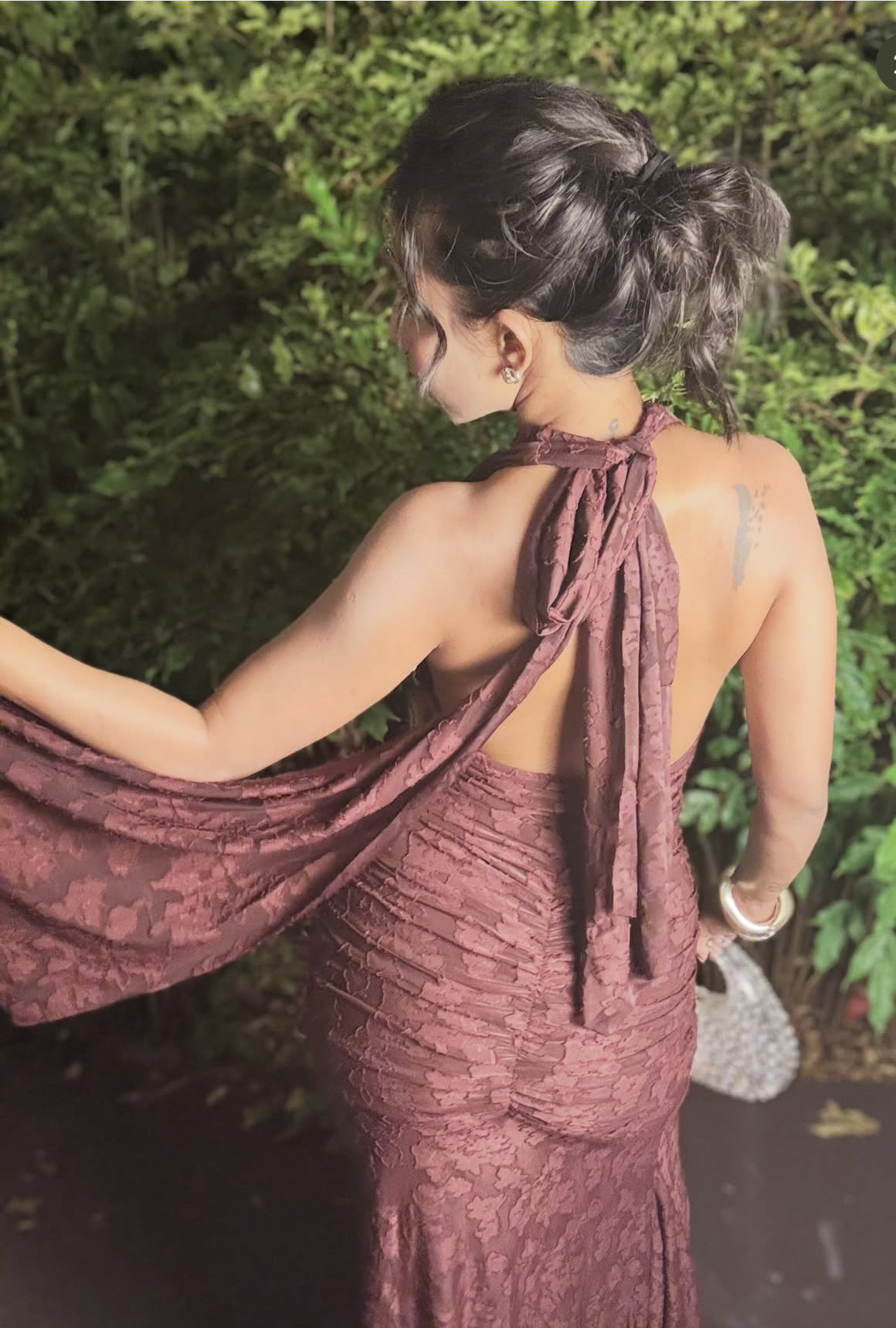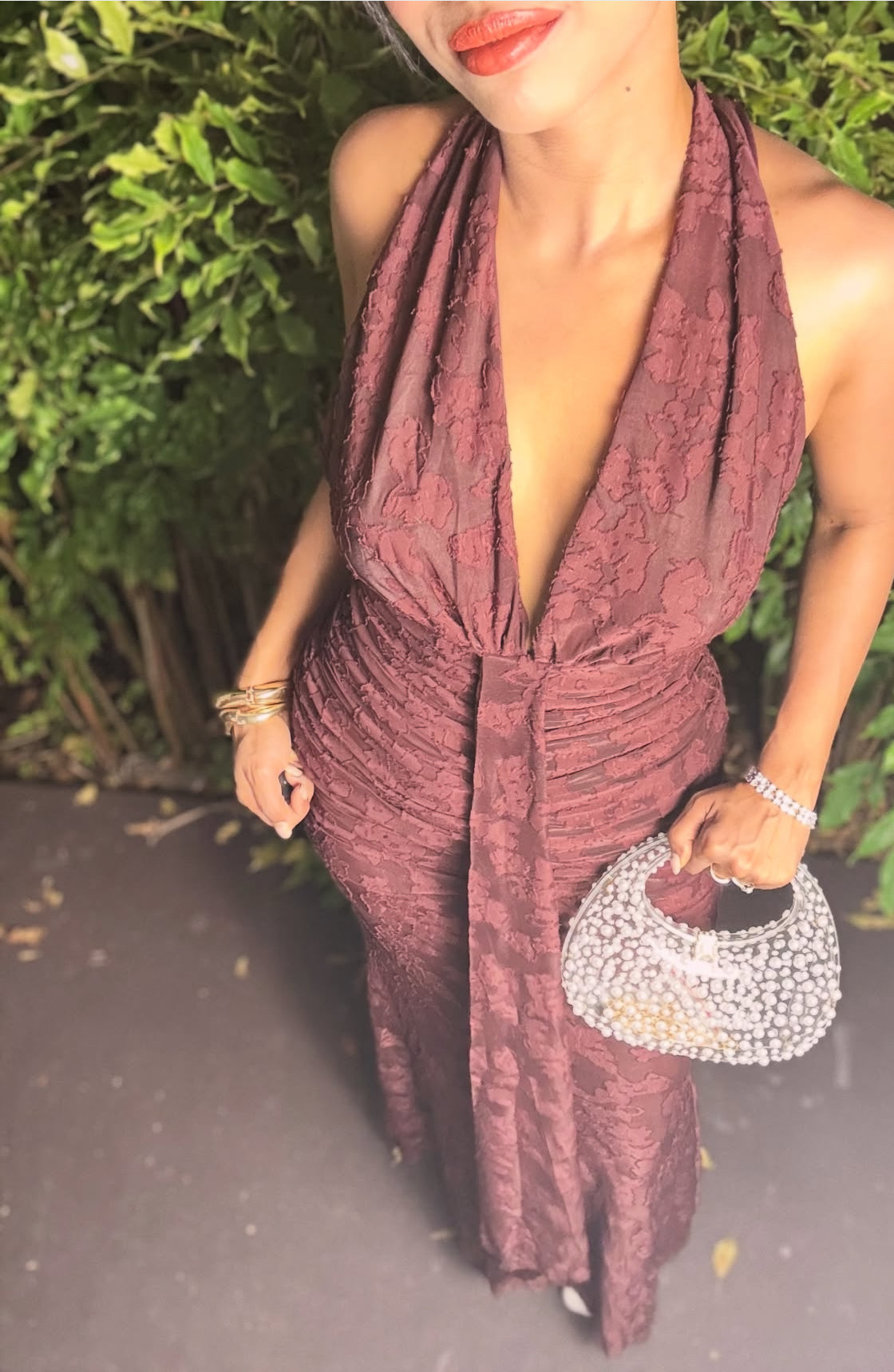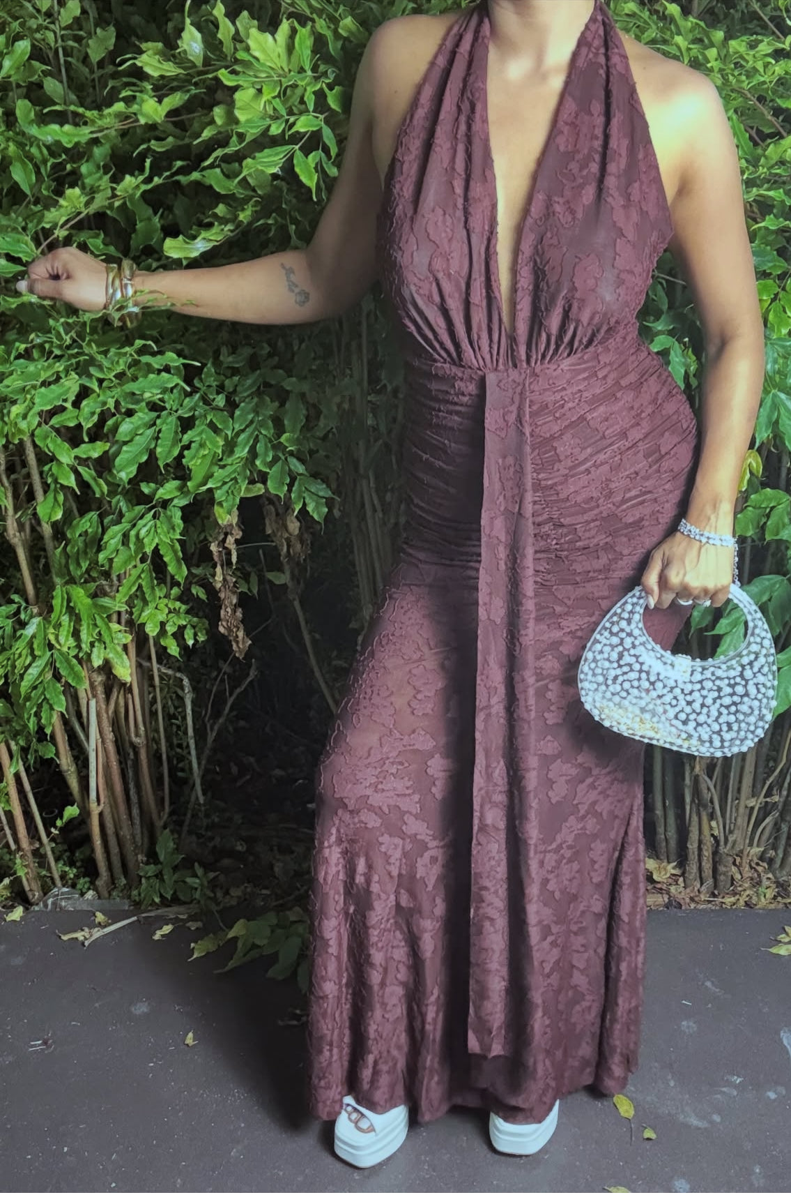 Rouge Dynasty Plunge Ruched Halter Lace Maxi Gown